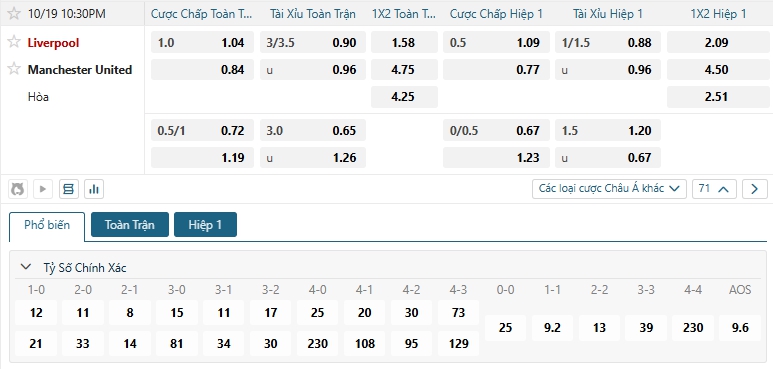 Nhà cái châu Á đang đánh giá cao khả năng chiến thắng của chủ nhà Liverpool là cao hơn so với Man Utd, khi đưa ra mức chấp đang là 1.0, với ưu thế sân nhà, thực lực được đánh giá cao hơn thì The Kop sẻ hứa hẹn sẻ là đội kiểm soát thế trận và đem đến nhiều khó khăn cho các vị khách, trên sân nhà Liverpool chơi ấn tượng khi bất bại ở cả 5 lần đón tiếp đối thủ, lựa chọn Liverpool cho kèo Châu Á.