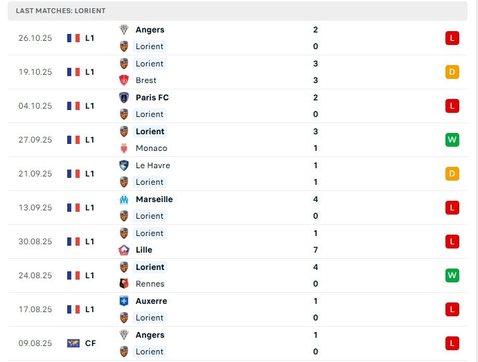 Lorient sau 9 lượt trận đầu tiên, hàng công của đội bóng này mang về 12 bàn thắng có được cùng hàng thủ chơi tệ khi nhận 22 bàn thua, hàng thủ chơi tệ khiến Lorient đang gặp nhiều khó khăn, ở 5 trận gần nhất họ để thủng lưới đến 9 lần, trên sân nhà của mình ở 4/5 trận gần nhất cũng vượt mốc trên 3 bàn thắng.