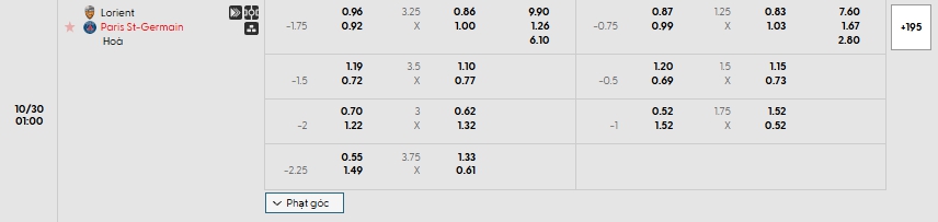 Bảng tỷ lệ kèo bóng đá trận đấu Lorient vs PSG