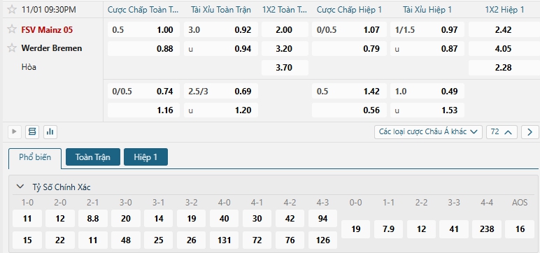 Bảng tỷ lệ kèo bóng đá trận đấu Mainz vs Werder Bremen