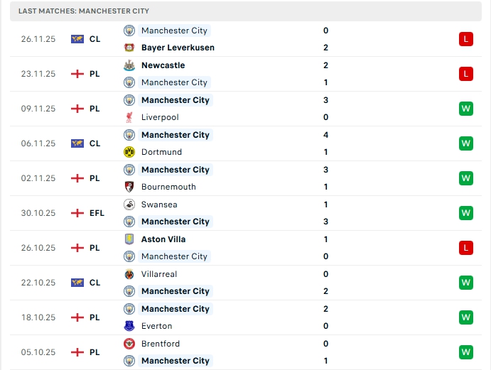 Man City sau 12 trận đấu họ mang về 7 chiến thắng, 1 hòa cùng 4 thất bại, có được 22 điểm và đang xếp vị trí thứ 3 trên BXH, ở vòng đấu gần nhất Man City bất ngờ nhận thất bại 1-2 trước Newcastle, đây là thất bại thứ 2 của họ ở 3 trận gần nhất, phong độ thời gian qua của Man City là khá tốt, trên sân nhà The Citizens thắng 4 trên 5 trận gần nhất.