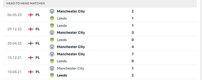 Những màn đụng độ giữa Man City và Leeds Utd thường diễn ra hấp dẫn với nhiều bàn thắng được tạo ra, cụ thể ở 5 lần gặp nhau gần nhất và 4/5 lần đón tiếp Leeds Utd trên sân nhà của Man City khép lại vượt mốc 3 bàn.