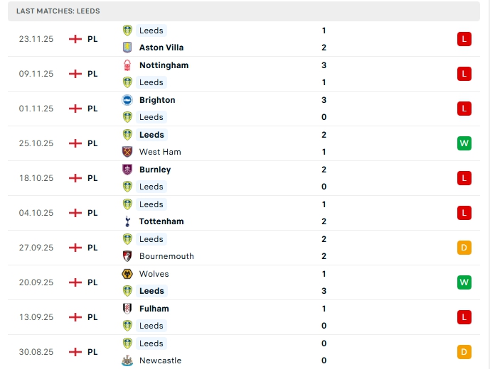 Bên kia sân, Leeds Utd sau 12 lượt trận họ có 3 chiến thắng, 2 hòa và 7 thất bại, có được 11 điểm và đang xếp vị trí thứ 18 trên BXH, ở vòng đấu gần nhất Leeds Utd nhận thất bại 1-2 trước Aston Villa, đây là trận thua thứ 3 liên tiếp của họ, phong độ thời gian qua của Leeds Utd là không tốt, khi xa nhà Leeds Utd cũng chơi tệ khi chỉ thắng 1 và thua 4 ở 5 trận gần nhất.