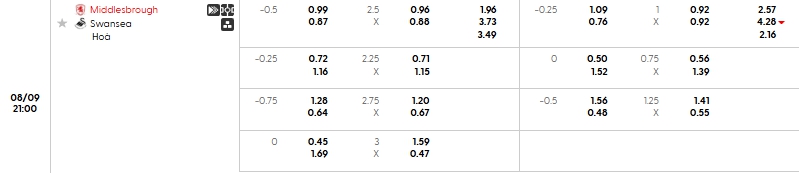 Bảng tỷ lệ kèo bóng đá trận đấu Middlesbrough vs Swansea City