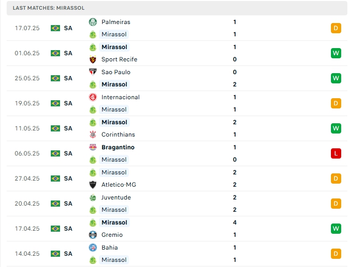 Mirassol sau 12 trận đấu họ mang về 18 bàn thắng cùng với hàng thủ nhận 13 bàn thua, 18 bàn thắng có được với một tân binh như Mirassol được xem là ấn tượng, 3/5 trận trên sân nhà vừa qua của Mirassol khép lại 90 phút từ 3 bàn thắng trở lên, hàng công chơi tốt nhưng hàng thủ của Mirassol cũng chưa thật sự chắc chắn.