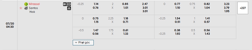 Nhà cái Châu Á đang đánh giá khả năng chiến thắng của các cầu thủ chủ nhà Mirassol cao hơn so với vị khách Santos qua mức chấp đang là 0.25, dù vậy trận đấu này nên đặt niềm tin vào Santos khi họ đang cho thấy sự trở lại của mình, hơn nữa Santos luôn là đội bóng lớn và đầy khó chịu, họ nhiều lần khiến Mirassol phải nhận thất bại, lựa chọn Santos cho kèo Châu Á sẻ an toàn hơn.