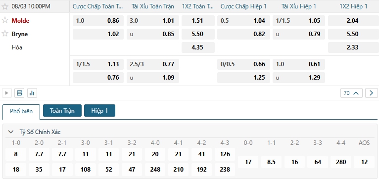 Bảng tỷ lệ kèo bóng đá trận đấu Molde vs Bryne