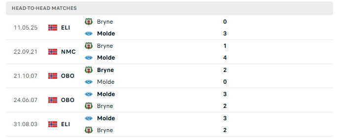 Những màn đụng độ giữa Molde và Bryne thường diễn ra hấp dẫn với nhiều bàn thắng được tạo ra, cụ thể ở 4/5 lần gặp nhau gần nhất của hai đội và 4/5 lần đón tiếp Bryne trên sân nhà của Molde khép lại vượt mốc 3 bàn.