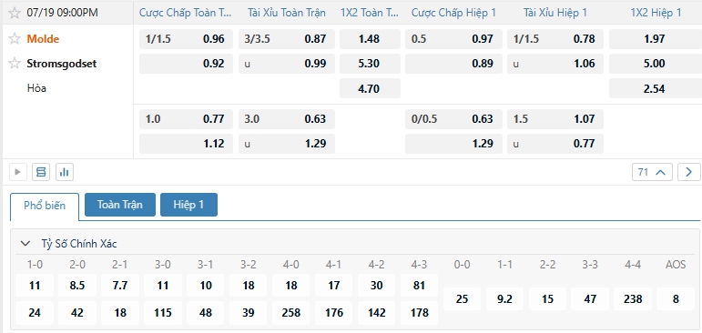 Nhà cái châu Âu đang đánh giá khả năng chiến thắng của Molde là cao hơn so với Stromsgodset khi đưa ra mức tỷ lệ cho Molde là 1.48 và các cầu thủ khách Stromsgodset là 5.30, Chênh lệch đủ lớn để đặt niềm tin vào Molde, ưu thế sân nhà, thực lực vượt trội cùng lịch sử đối đầu toàn thắng ở cả 5 lần đón tiếp, lựa chọn Molde cho kèo Châu Âu.