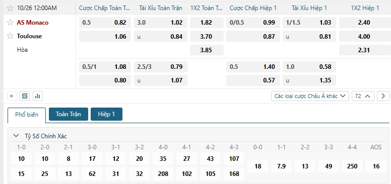 Bảng tỷ lệ kèo bóng đá trận đấu Monaco vs Toulouse