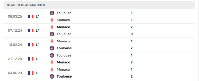 Lịch sử đối đầu của Monaco vs Toulouse