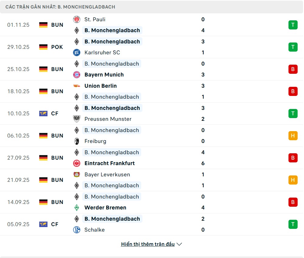 Monchengladbach đang trải qua giai đoạn chông chênh. Sau 9 vòng đấu, họ chỉ mới có 1 chiến thắng, 3 trận hòa và tới 5 thất bại – đứng tận vị trí thứ 16. Vấn đề lớn nhất nằm ở hàng thủ: 18 bàn thua, trung bình 2 bàn/trận, đủ nói lên sự mong manh. Hàng công ghi được 10 bàn, nhưng hiệu suất đó chẳng đủ bù lại những sai lầm phía sau.