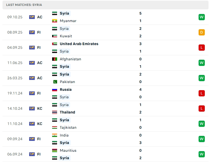 Syria sau 3 trận đấu, hàng công của đội bóng này mang về 8 bàn thắng cùng hàng thủ chắc chắn khi chỉ nhận 1 bàn thua, Syria đang sở hữu hàng công ấn tượng, đặc biệt khi xa nhà ở 3/5 trận vừa qua khép lại trên 3 bàn.
