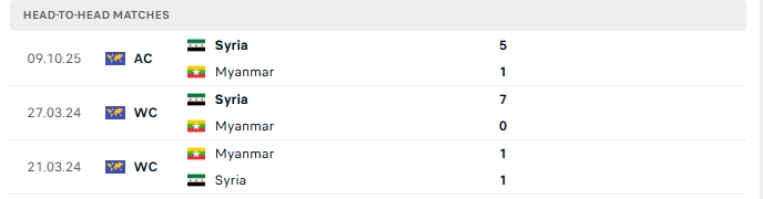 Những lần đụng độ giữa Myanmar và Syria thường diễn ra hấp dẫn với nhiều bàn thắng được tạo ra, cụ thể trong 3 lần gặp nhau gần nhất có đến 15 bàn thắng được tạo ra, trong đó 2/3 trận khép lại 90 phút trên 5 bàn, trận đấu sắp tới cũng sẻ hứa hẹn bùng nổ bàn thắng.
