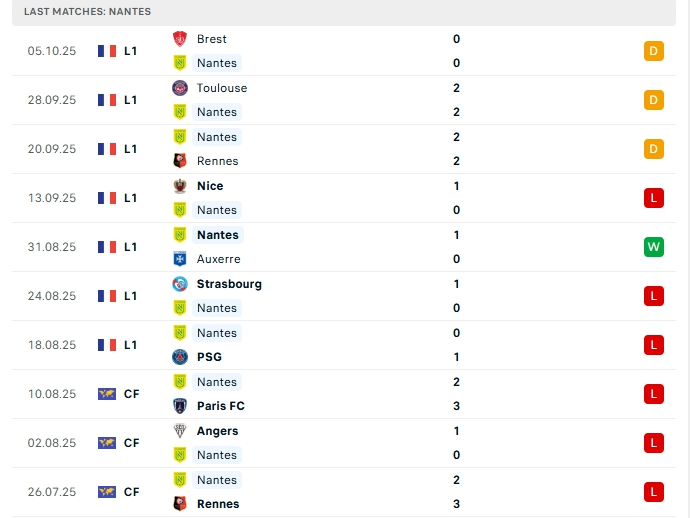 Nantes ở vòng đấu gần nhất họ có trận hòa 0-0 trước Brest, đây là trận hòa thứ 3 liên tiếp của họ, sau 7 trận đấu với 1 chiến thắng, 3 hòa cùng với 3 thất bại, thì Nantes đang có được 6 điểm, xếp vị trí thứ 15 trên BXH, phong độ thời gian qua của Nantes là không tốt, đội bóng này chỉ thắng 1 ở 10 trận gần nhất, trên sân nhà của mình Nantes cũng đang chơi tệ khi thua 4, hòa 1 và chỉ thắng 1 sau 6 trận đấu.