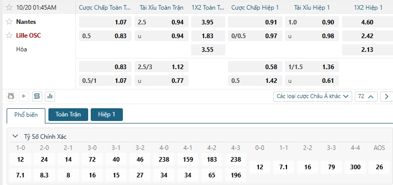 Nhà cái châu Á đang đánh giá cao khả năng chiến thắng của các vị khách Lille là cao hơn , khi đưa ra mức chấp đang là 0.5, Lille dù phải thi đấu xa nhà nhưng thực lực được đánh giá cao hơn, hơn nữa phong độ của đội bóng này là khá tốt, trong khi Nantes đang chơi tệ, đặc biệt trên sân nhà, lựa chọn Lille ở kèo châu Á.