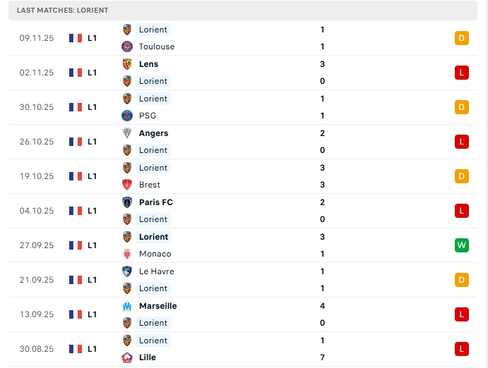 Bên kia sân, Lorient sau 12 trận đấu họ có được 2 chiến thắng, 4 hòa và 6 thất bại, có được 10 điểm và đang xếp vị trí thứ 17 trên BXH, phong độ thời gian qua của Lorient là không tốt, ở trận gần nhất Lorient có kết quả hòa trước Toulouse, đây là trận không thắng thứ 6 liên tiếp, với 3 thất bại cùng 3 hòa, khi thi đấu xa nhà Lorient cũng chơi tệ khi thua 4 và hòa 1 ở 5 trận gần nhất.