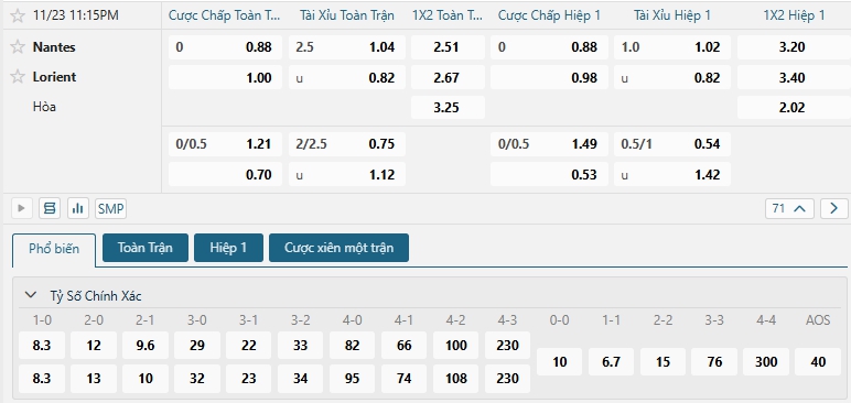 Bảng tỷ lệ kèo bóng đá trận đấu Nantes vs Lorient