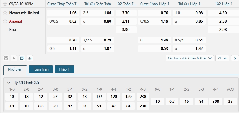 Nhà cái châu Á đang đánh giá cao khả năng chiến thắng của các vị khách Arsenal là cao hơn, khi đưa ra mức chấp đang là 0.25, Arsenal sở hữu lối chơi ấn tượng, thực lực được đánh giá cao hơn, dù họ phải thi đấu xa nhà nhưng Pháo thủ chơi thăng hoa trên sân khách, trong khi Newcastle đang có khởi đầu không tốt ở mùa giải năm nay, trận đấu này nên đặt niềm tin vào các vị khách Arsenal ở kèo châu Á.