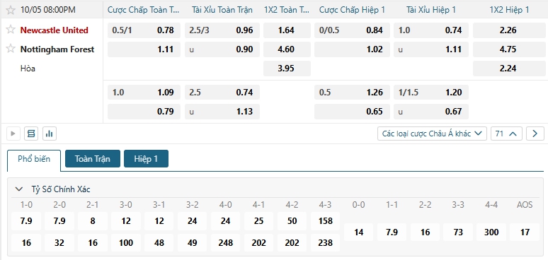 Nhà cái châu Âu đang đánh giá cao khả năng chiến thắng của chủ nhà là cao hơn so với đối thủ khi đưa ra mức tỷ lệ là 1.64 và các cầu thủ khách Nottingham Forest là 4.60, Newcastle có ưu thế sân nhà sở hữu thực lực cùng chất lượng đội hình được đánh giá cao hơn, hơn nữa lịch sử đối đầu cũng đang ủng hộ, lựa chọn Newcastle cho kèo châu Âu.