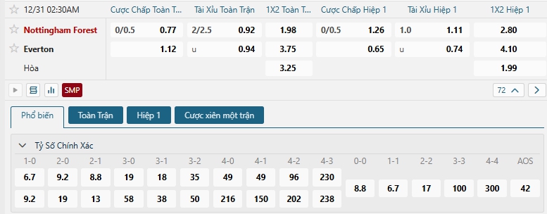 Bảng tỷ lệ kèo bóng đá trận đấu Nottingham Forest vs Everton