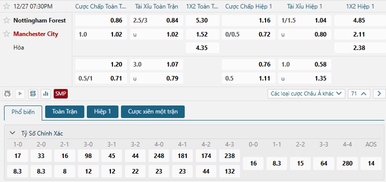 Bảng tỷ lệ kèo bóng đá trận đấu Nottingham Forest vs Man City