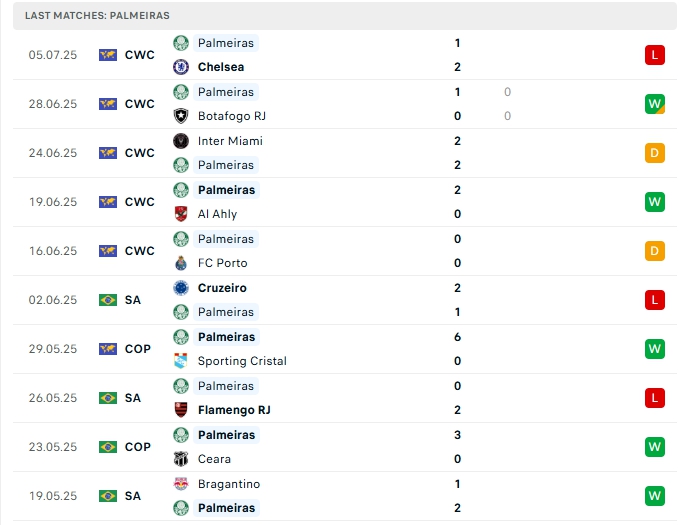 Palmeiras sau 11 trận đấu họ mang về 12 bàn thắng cùng với hàng thủ cực kỳ chắc chắn khi chỉ nhận 8 bàn thua, lối chơi của Palmeiras thiên về phòng ngự nên hiệu suất ghi bàn của hàng công là không quá cao, 3/5 trận gần nhất của họ khép lại 90 phút không quá 2 bàn và cả 5 trận trên sân nhà vừa qua ở giải đấu quốc nội cũng khép lại với kết quả tương tự.