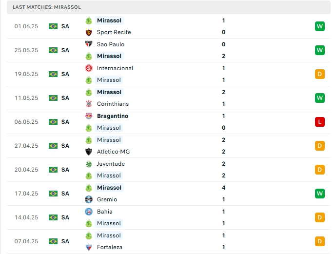 Mirassol sau 11 trận đấu họ mang về 17 bàn thắng cùng với hàng thủ nhận 12 bàn thua, lối chơi của Mirassol cũng thiên về phòng ngự nên những trận đấu của họ thường diễn ra với sự chặt chẻ và ít bàn thắng, 4/5 trận gần nhất của Mirassol khép lại không quá 2 bàn và 4/5 trận xa nhà cũng có kết quả tương tự.