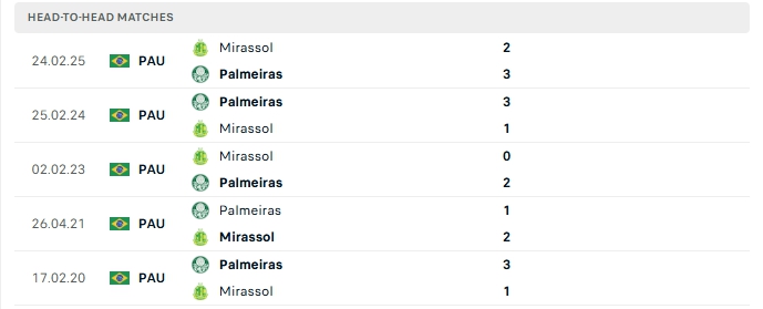 Lịch sử đối đầu của Palmeiras vs Mirassol
