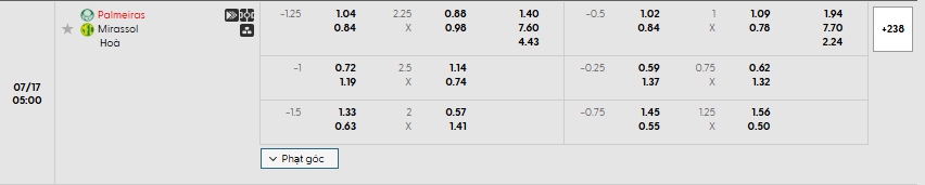 Bảng tỷ lệ kèo bóng đá trận đấu Palmeiras vs Mirassol