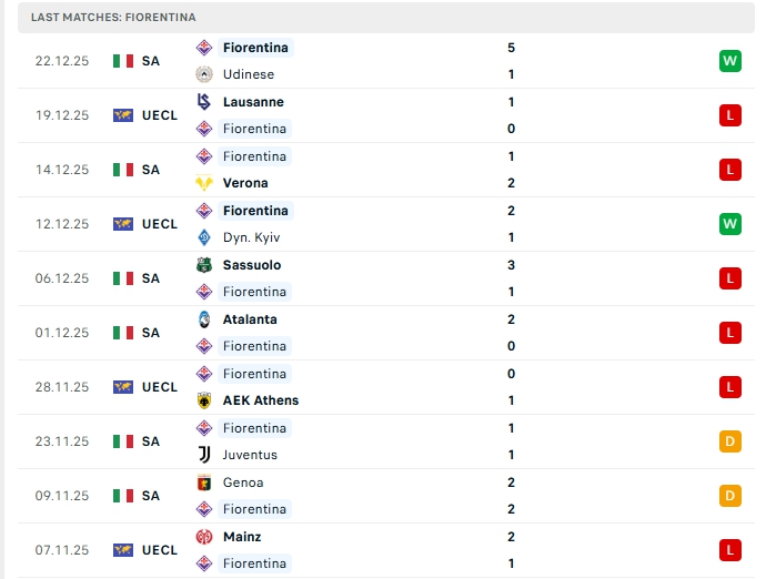 Fiorentina sau 16 trận đấu, đội bóng này mang về 17 bàn thắng cùng hàng thủ nhận 27 bàn thua, hàng thủ chơi thiếu chắc chắn khiến Fiorentina đang gặp nhiều khó khăn, họ cần sớm cải thiện tình hình, đặc biệt nơi hàng thủ nếu không muốn tiếp tục lún sâu.