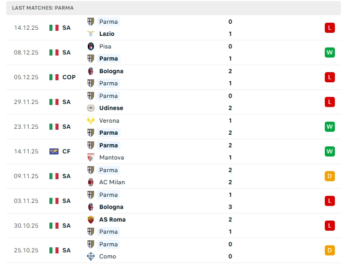 Parma sau 15 vòng đấu, đội bóng này mang về 3 chiến thắng, 5 hòa cùng 7 thất bại, có được 14 điểm và đang xếp vị trí thứ 16 trên BXH, ở vòng đấu gần nhất Parma nhận thất bại 0-1 trước Lazio, đây là thất bại thứ 3 của họ ở 4 trận gần nhất, trong đó có 1 thất bại ở đấu trường Cup, phong độ thời gian qua của Parma là không tốt, trên sân nhà họ cũng chỉ thắng 1, hòa 1 và thua 3 sau 5 trận đã đá.