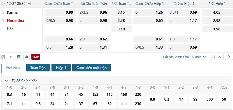 Bảng tỷ lệ kèo bóng đá trận đấu Parma vs Fiorentina