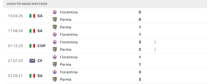 Những màn đụng độ giữa Parma và Fiorentina thường diễn ra chặt chẻ với ít bàn thắng được tạo ra, cụ thể ở 3/5 lần gặp nhau gần nhất của hai đội và 4/5 lần đón tiếp Fiorentina trên sân của Parma khép lại không quá 2 lần lưới rung.
