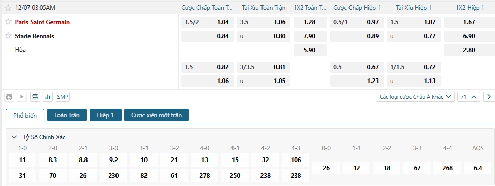 Nhà cái châu Á đang đánh giá cao khả năng chiến thắng của chủ nhà PSG là cao hơn so với Stade Rennais, khi đưa ra mức chấp đang là 1.75, ưu thế sân bãi đang giúp PSG được đánh giá cao, họ sở hữu thực lực vượt trội so với đối thủ, dù vậy với việc Stade Rennais đang chơi tốt thời gian qua cùng với những lần đối đầu khó tạo chiến thắng cách biệt gần đây thì PSG khó tạo chiến thắng quá 2 bàn trong trận đấu này, lựa chọn Stade Rennais ở kèo châu Á.