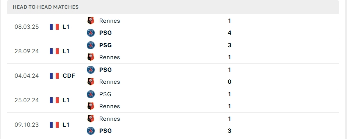 Lịch sử đối đầu của PSG vs Stade Rennais