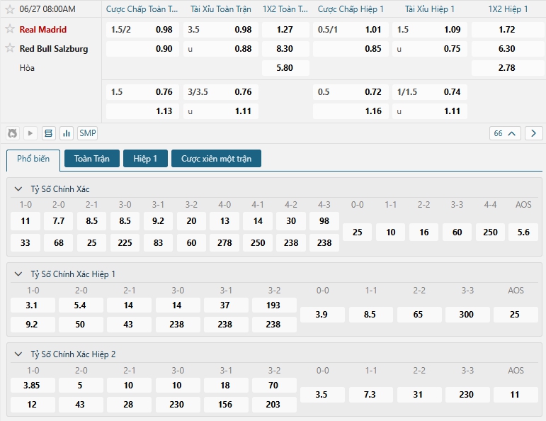 Bảng tỷ lệ kèo bóng đá trận đấu RB Salzburg vs Real Madrid