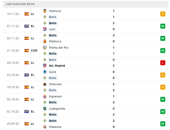 Real Betis sau 12 trận đấu, đội bóng này mang về 5 chiến thắng, 2 hòa và nhận 5 thất bại, có được 20 điểm và đang xếp vị trí thứ 5 trên BXH, ở vòng đấu gần nhất Real Betis có trận hòa trước Valencia, trận hòa này nối dài chuỗi 4 trận bất bại, trong đó có 3 chiến thắng, trên sân nhà Real Betis cũng đang chơi tốt với 3 chiến thắng ở 4 trận gần nhất.