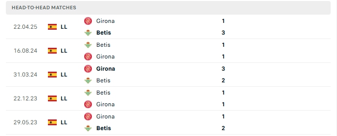 Những màn đụng độ giữa Real Betis và Girona thường diễn ra hấp dẫn với nhiều bàn thắng được tạo ra, cụ thể ở 3/5 lần gặp nhau gần nhất của hai đội và 3/5 lần đón tiếp Girona trên sân của Real Betis khép lại chạm mốc 3 bàn.
