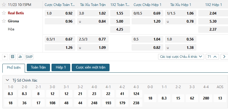Bảng tỷ lệ kèo bóng đá trận đấu Real Betis vs Girona