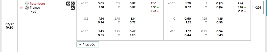 Bảng tỷ lệ kèo bóng đá trận đấu Rosenborg vs Tromso