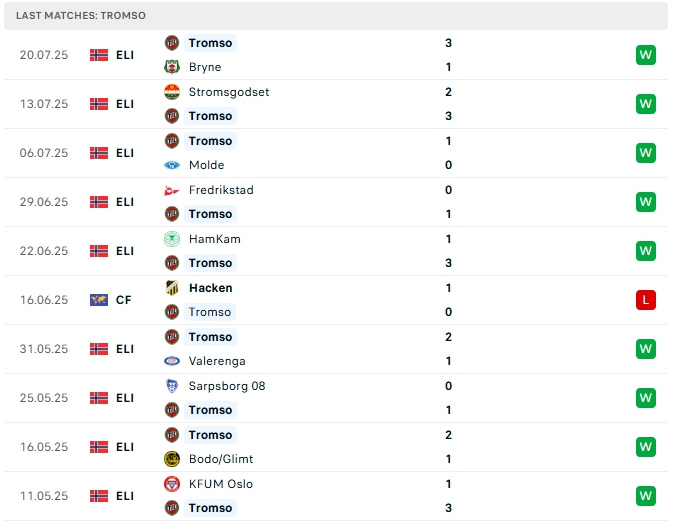 Bên kia sân, Tromso ở vòng đấu gần nhất họ có được chiến thắng trước Bryne, đây là trận thắng thứ 5 liên tiếp, sau 14 trận đấu cùng với 10 chiến thắng, 1 hòa và 3 thất bại có được 31 điểm và đang xếp vị trí thứ 2 trên BXH, phong độ thời gian qua của Tromso là ấn tượng, khi thi đấu xa nhà Tromso đang chơi tốt với 5 chiến thắng liên tiếp vừa qua.