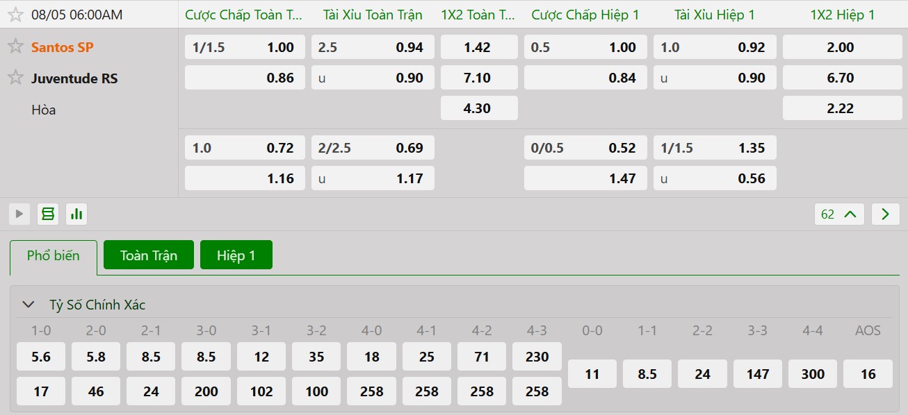 Bảng tỷ lệ kèo bóng đá trận đấu Santos vs Juventude