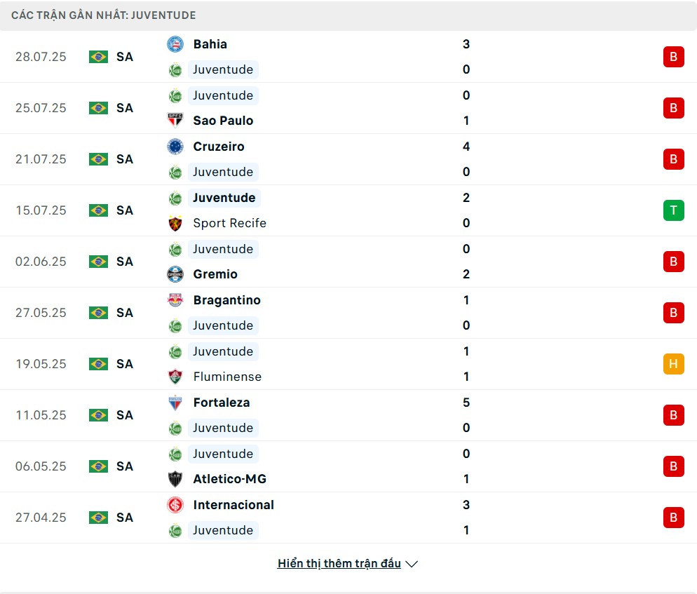 Phía đối diện, Juventude đang “chạm đáy” về cả phong độ lẫn tinh thần. 3 chiến thắng, 2 hòa và 10 thất bại sau 15 trận khiến họ đứng áp chót BXH. Nhưng điều đáng sợ hơn là… họ chưa có nổi 1 điểm nào trên sân khách mùa này. Thất bại trắng cả 7 lần hành quân – thống kê khiến ngay cả những cổ động viên lạc quan nhất của Juventude cũng phải thở dài.