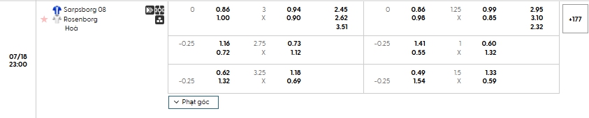 Bảng tỷ lệ kèo bóng đá trận đấu Sarpsborg vs Rosenborg