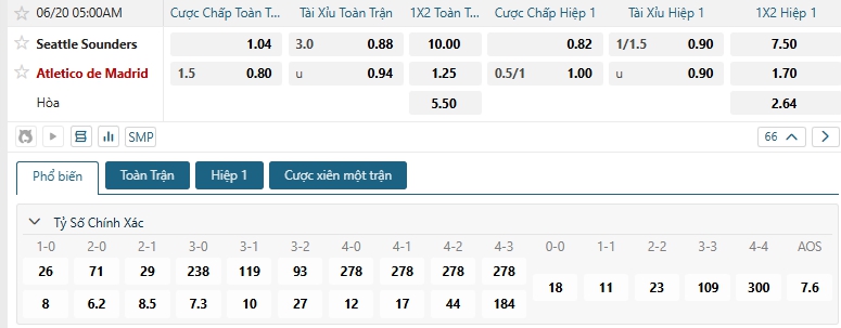 Nhà cái châu Âu đang đánh giá khả năng có được chiến thắng của Atletico Madrid là cao hơn so với Seattle Sounders trong trận đấu này qua mức tỷ lệ là 1.25 so với đối thủ là 10.00, chênh lệch đủ lớn để đặt niềm tin vào Atletico Madrid trong trận đấu này, lựa chọn Atletico Madrid cho kèo Châu Âu.