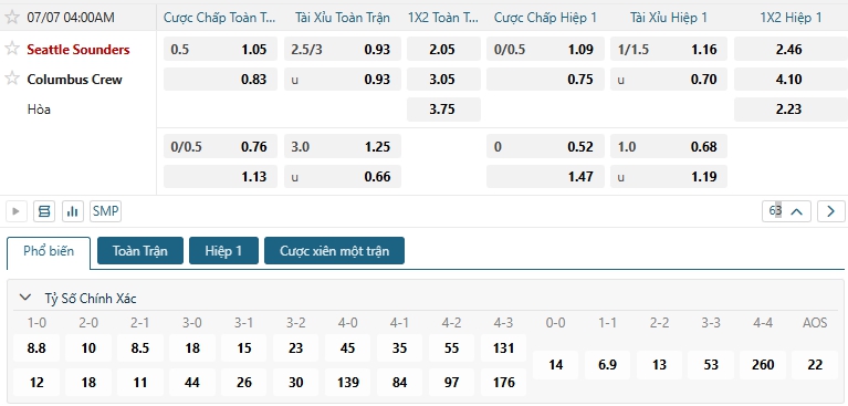 Bảng tỷ lệ kèo bóng đá trận đấu Seattle Sounders vs Columbus Crew