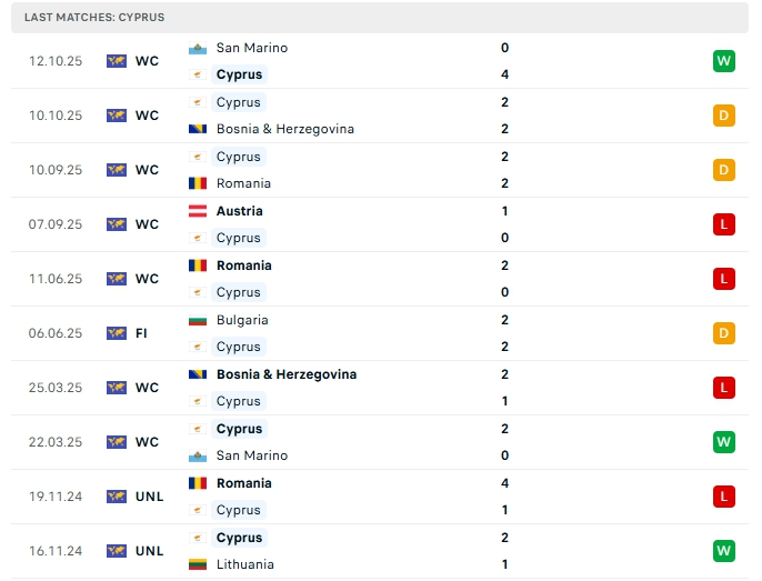 Síp sau 7 trận đấu hàng công đội bóng này mang về 11 bàn thắng cùng hàng thủ nhận 9 bàn thua, 3/5 trận đấu đó khép lại từ 3 bàn thắng trở lên, trên sân nhà của mình ở 4/5 trận gần nhất của Síp cũng vượt mốc trên 3 bàn.