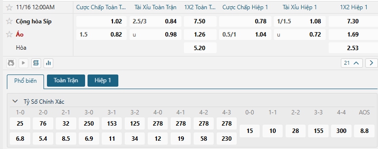 Bảng tỷ lệ kèo bóng đá trận đấu Síp vs Áo