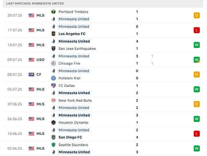 Minnesota Utd sau 24 trận đấu hàng công chơi tốt với 40 bàn thắng cùng hàng thủ nhận 27 bàn thua, 4/5 trận gần nhất của Minnesota Utd họ đều để các đối thủ chọc thủng lưới và 3/5 trận xa nhà của Minnesota Utd cũng khép lại 90 phút từ 3 bàn thắng trở lên.